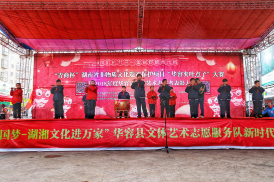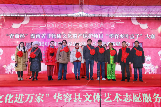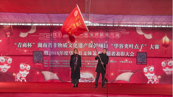 2月19日上午,在这春潮涌动、万众欢腾的元宵佳节,我们的节日、“青商杯”湖南省非物质文化遗产保护项目“华容夹叶点子”大赛暨2018年度华容县文体艺术志愿者表彰大会在华容县城市广场隆重举行。本次活动由华容县新时代文明实践中心、华容县文化广电新闻出版旅游局、华容县工商业联合会、共青团华容县委主办,由华容县文化馆、华容县非物质文化遗产保护中心、华容县青年企业家商会承办。县委常委、宣传部长杨景,副县长范文科,县政协副主席、工商联主席刘云华参加表彰大会并授奖。