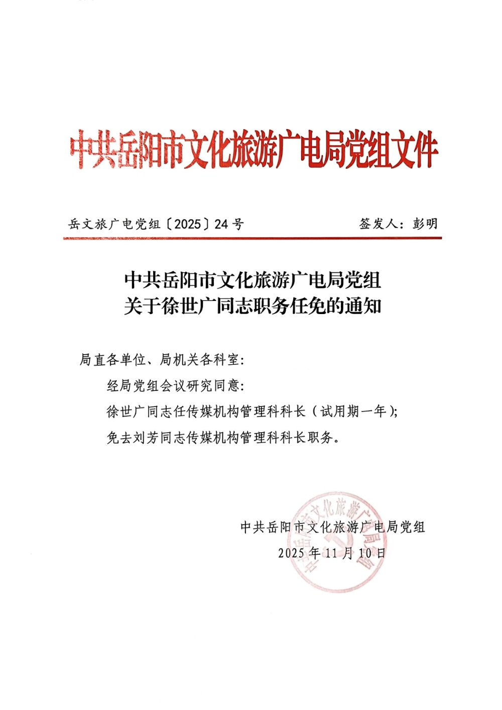 关于徐世广同志职务任免的通知(岳文旅广电党组〔2025〕24号)