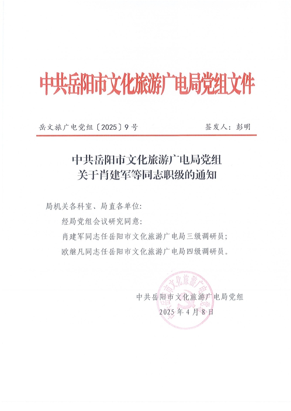 关于肖建军等同志职级的通知(岳文旅广电党组〔2025〕9号)