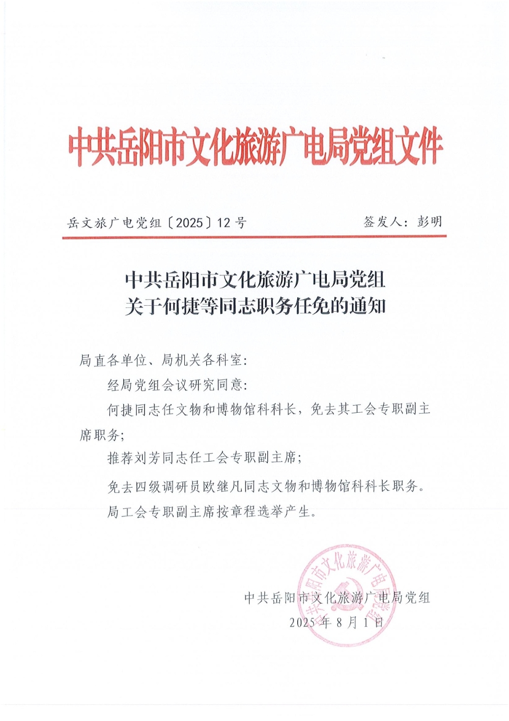 关于何捷等同志职务任免的通知(岳文旅广电党组〔2025〕12号)