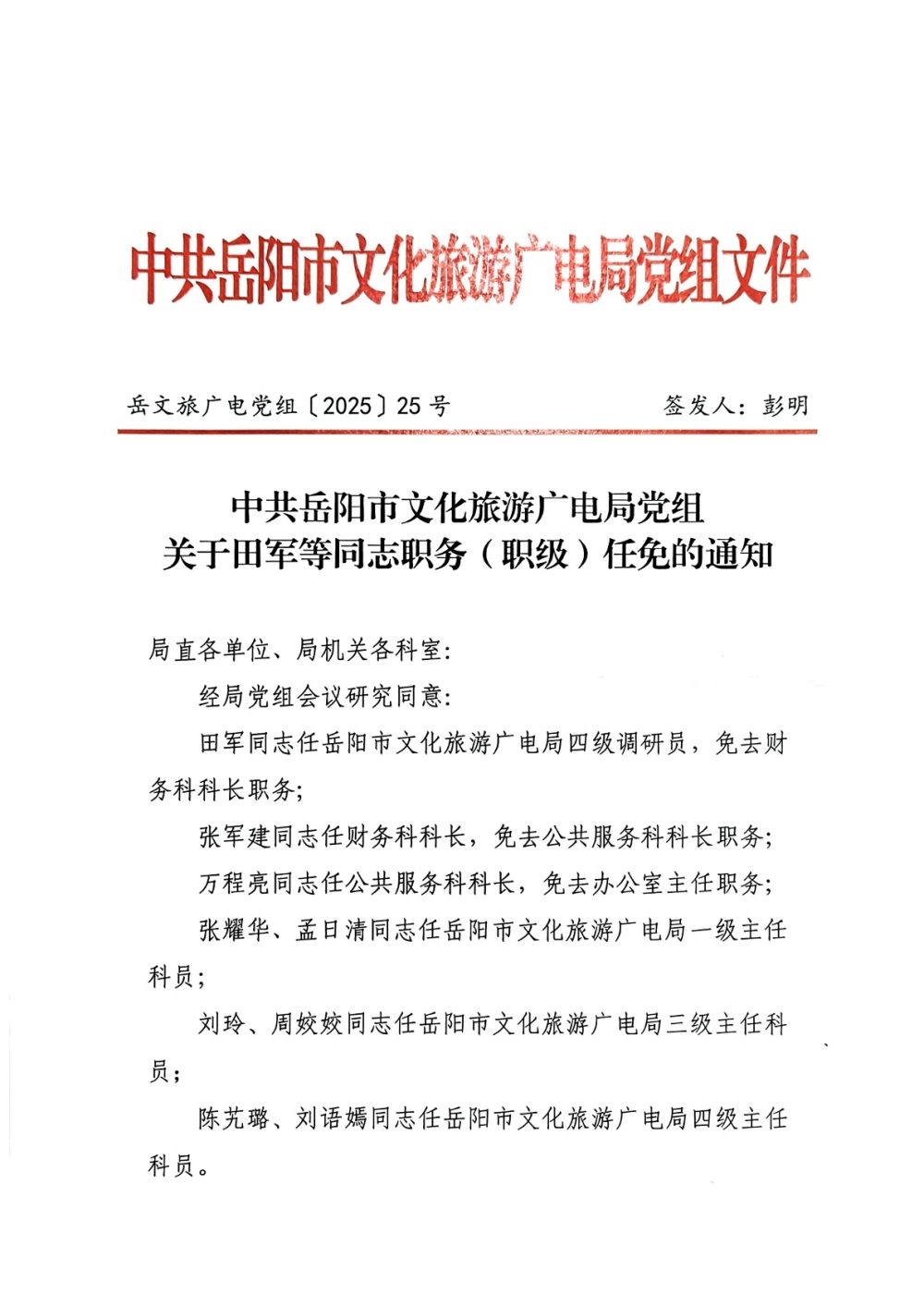 关于田军等同志职务(职级)任免的通知(岳文旅广电党组〔2025〕25号)