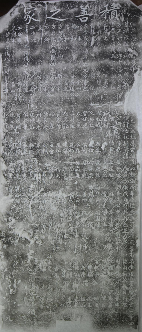 “积善之家”石碑为花岗岩青石,通高166厘米(座高36厘米),宽54厘米,厚22厘米,额顶右旋读横刻“积善之家”四字,下方右边竖刻二行81字的“积善之家记”,左边横刻9排140位捐资者芳名。