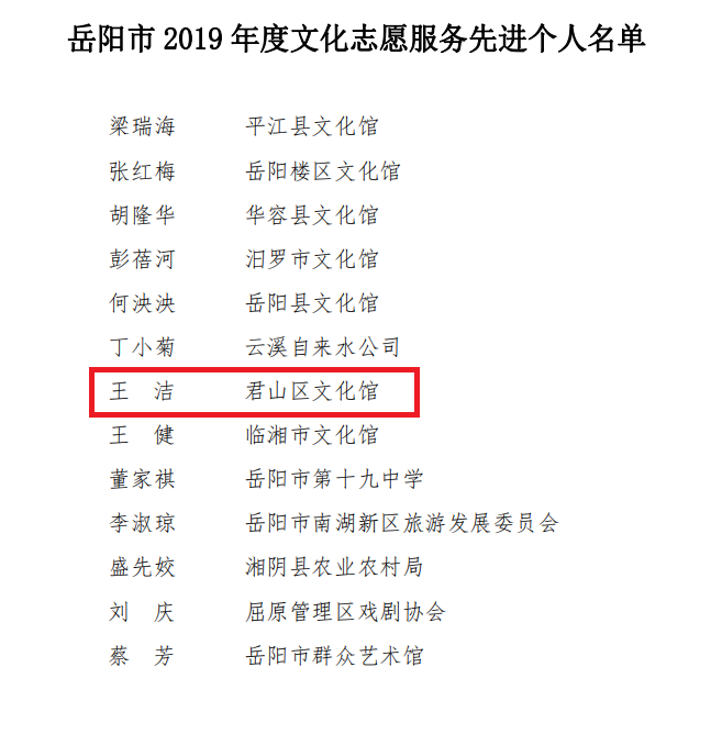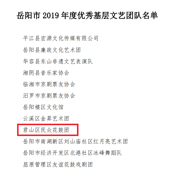 近日,岳阳市文化旅游广电局发布《关于表彰2019年度优秀基层文艺团队和文化志愿服务先进个人的通报》,君山区民众花鼓剧团、王洁同志分获岳阳市2019年度优秀基层文艺团队和文化志愿服务先进个人。
