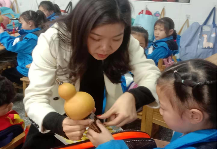 图为老师正在手把手地教同学吹奏葫芦丝