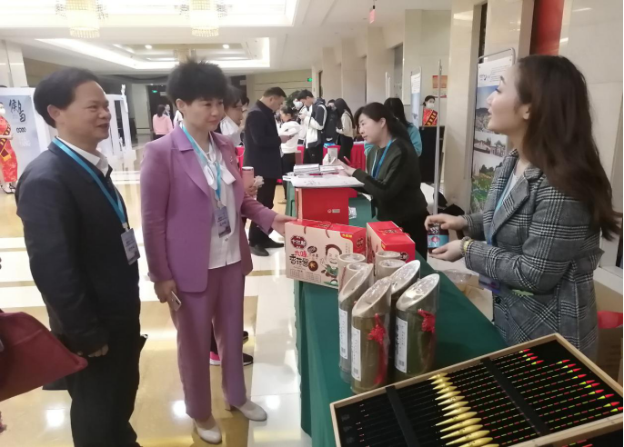 临湘市人民政府副市长熊丽和全国劳动模范李国武在临湘旅游产品展台前