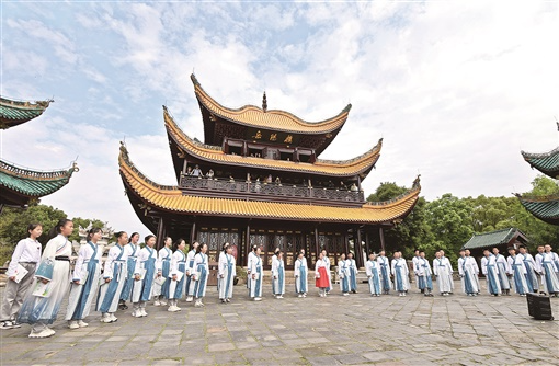 4月27日,岳阳市岳阳楼小学学生在岳阳楼下诵读《岳阳楼记》。近年来,该校秉承“承千年文脉、育忧乐少年”办学理念,依托名楼文化开展教育实践活动,让学生传承传统文化,在经典中浸润成长。