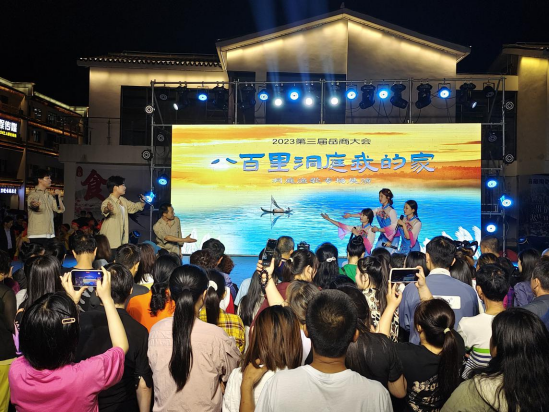 聚天下岳商,绘巴陵胜状。5月5日晚,第三届岳商大会露天音乐晚会在洞庭南路历史文化街区举行。岳阳楼区国家级非物质文化遗产保护项目“洞庭渔歌”、原创广场舞《岳阳楼下我的家》亮相“文化夜游”板块,助力岳商大会。