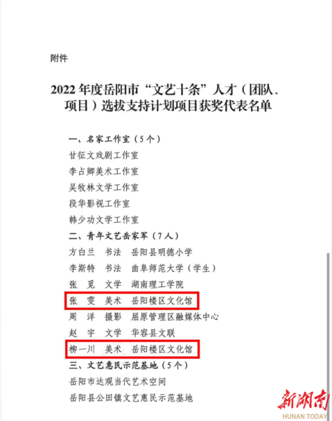 2022年度岳阳市“文艺十条”人才(团队、项目)选拔支持计划项目获奖代表名单近日正式出炉,岳阳楼区文化馆柳一川、张雯入选“青年文艺岳家军”。该项目共仅7人入选,岳阳楼区文化馆囊括美术类全部名额。