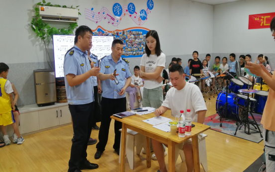 执法人员向社会艺术水平考级机构现场负责人出示执法证件