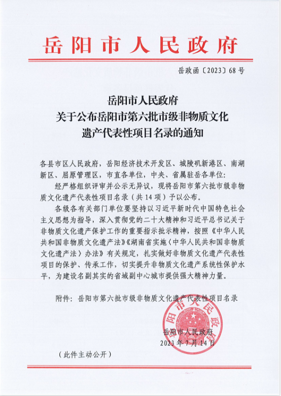 (通讯员 何莹莹)近期,岳阳市人民政府公布了岳阳市第六批市级非物质文化遗产代表性项目名录,共14个项目入选,临湘的绿茶制作技艺(白石毛尖茶制作技艺)名列其中。