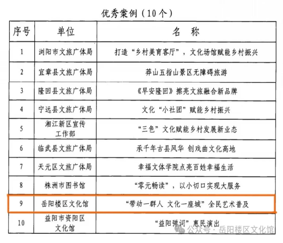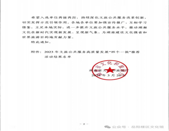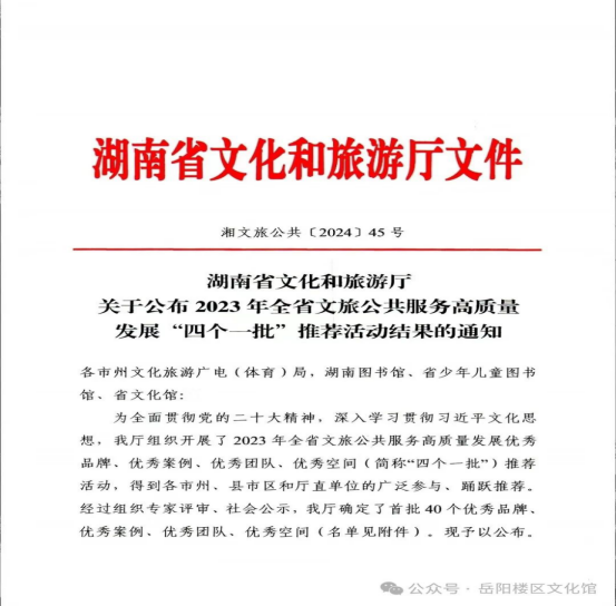 3月26日,湖南省文化和旅游厅发布关于公布2023年全省文旅公共服务高质量发展“四个一批”推荐活动结果的通知,岳阳楼区文化馆荣获全省文旅公共服务高质量发展“四个一批”优秀案例项目。
