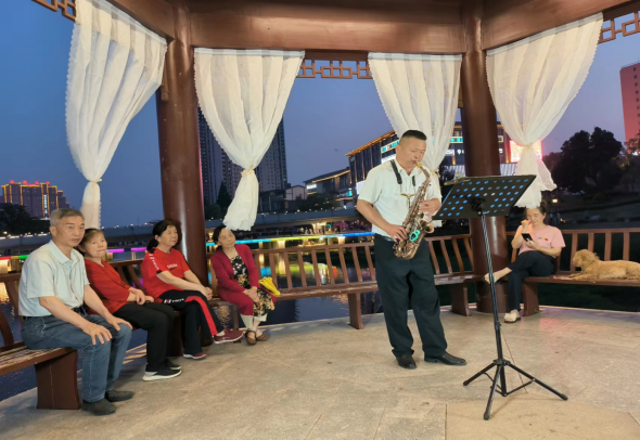 活动现场,久音工作室带来了一场唯美的萨克斯专场音乐会,表演者们带来了多首经典与现代交融的萨克斯曲目,展现了萨克斯音乐的多样性和深邃内涵。在全新打造的八角亭内,黄汨辉老师的萨克斯精彩演奏,感染了在场的每一位观众。花船上市文化馆志愿者吹奏着旋律动听的葫芦丝,仿佛山间的清泉缓缓地流淌在友谊河。