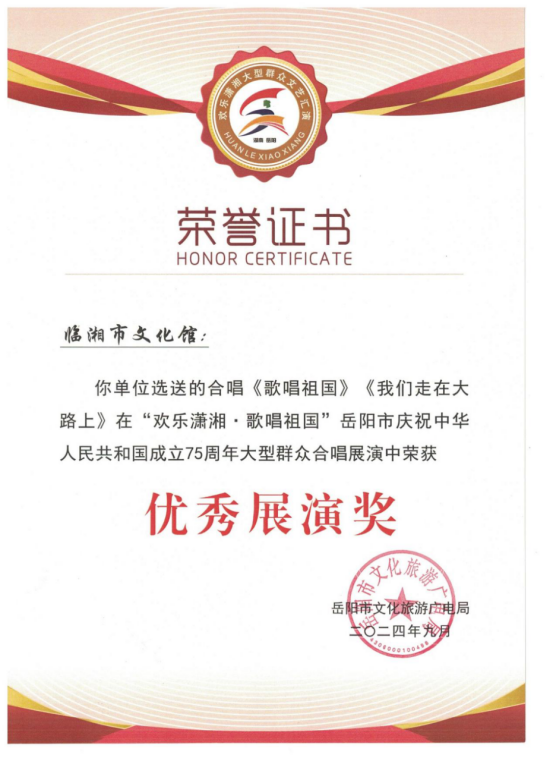 (通讯员 唐佳丽)9月3日,由临湘市文化馆选送的大合唱《歌唱祖国》《我们走在大路上》参加“欢乐潇湘·歌唱祖国”岳阳市庆祝中华人民共和国成立75周年大型群众合唱展演,获优秀展演奖。
