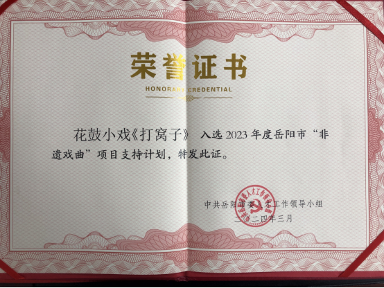 本年度,该中心积极履行岗位职责,工作获社会各界认可。3月获“岳阳市优秀基层文艺团队”称号,同时,创作的花鼓小戏《打窝子》入选岳阳市“非遗戏曲”项目支持计划。7月,获国家级非物质文化遗产保护扶持资金30万元。该中心认真推动各项工作创新发展,以优异成绩展现了新时代戏剧人的熠熠风采。(沈云凤)