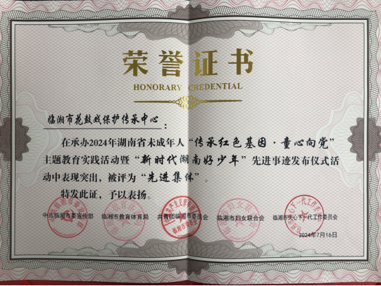 获承办2024年湖南省未成年人“传承红色基因.童心向党”主题教育实践活动暨“新时代湖南好少年”先进事迹发布仪式活动“先进集体”嘉奖