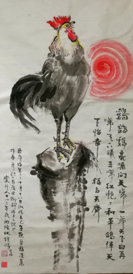 10月18日上午,湘阴组织各单位、乡镇、企业、学校、社区、村组和家庭,纷纷通过广播、电视、网络等多种形式收听收看十九大开幕盛况。82岁的艺术家伏煌曙先生在家中观看电视直播后,当晚再次收看电视重播,他激情澎湃,连夜即兴挥毫作画《金鸡报晓》,并作诗“鸡、鸡、鸡,亮嗓向天啼。一啼天下白,再啼天下曦,三啼红艳艳。和平鸽阵天下怡,幸福与天齐。”