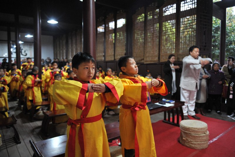 德育春风,润物无声。“拜——兴——”当日9时许,跟随左宗棠书院礼仪老师的话音和动作,100余少年儿童整肃衣冠,向大成至圣先师孔子和民族英雄左宗棠的画像躬行传统儒礼“三拜三兴”。紧接着,孩子们来到书院国学课堂接受国学熏陶。经典朗诵、书法展示、武术表演、专题讲座……