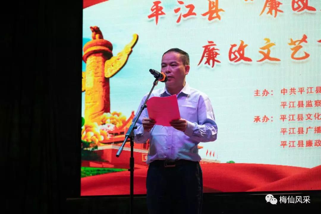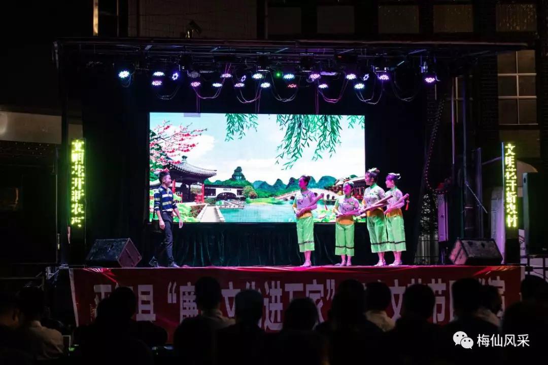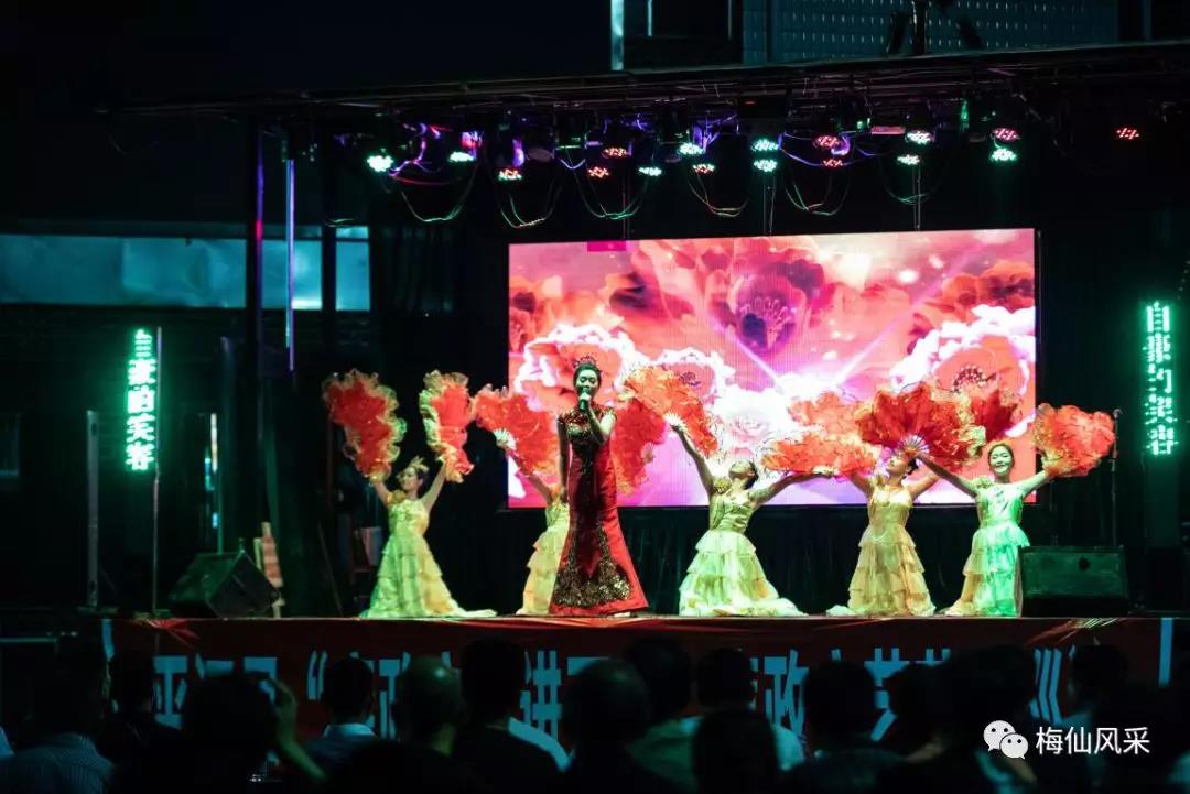 夜幕下的梅仙镇灯火通明、人头攒动。演出在喜庆吉祥的歌舞《我们的中国梦》中拉开帷幕。渔鼓表演唱《文明花放新农村》唱出了推进移风易俗工作以来,给农村带来的巨大变化;小组唱《助廉好了歌》为现场观演的干部群众上了一堂廉政党课;小品《懒汉脱贫》讲述了在脱贫攻坚工作中,帮扶人与贫困户交心,竭尽全力帮助贫困户脱贫的感人故事;文艺演出中途,还设置了廉政知识有奖问答环节。台上,主持人围绕廉政工作相关知识提问,台下,干部群众争先恐后答题……演出在戏曲联唱《包公铡美》中圆满落幕。整场演出,节目喜闻乐见,贴近主题、贴近生活、贴近群众,弘扬了清正廉洁、文明节俭、无私奉献的时代新风背景,得到了现场观众的阵阵掌声。