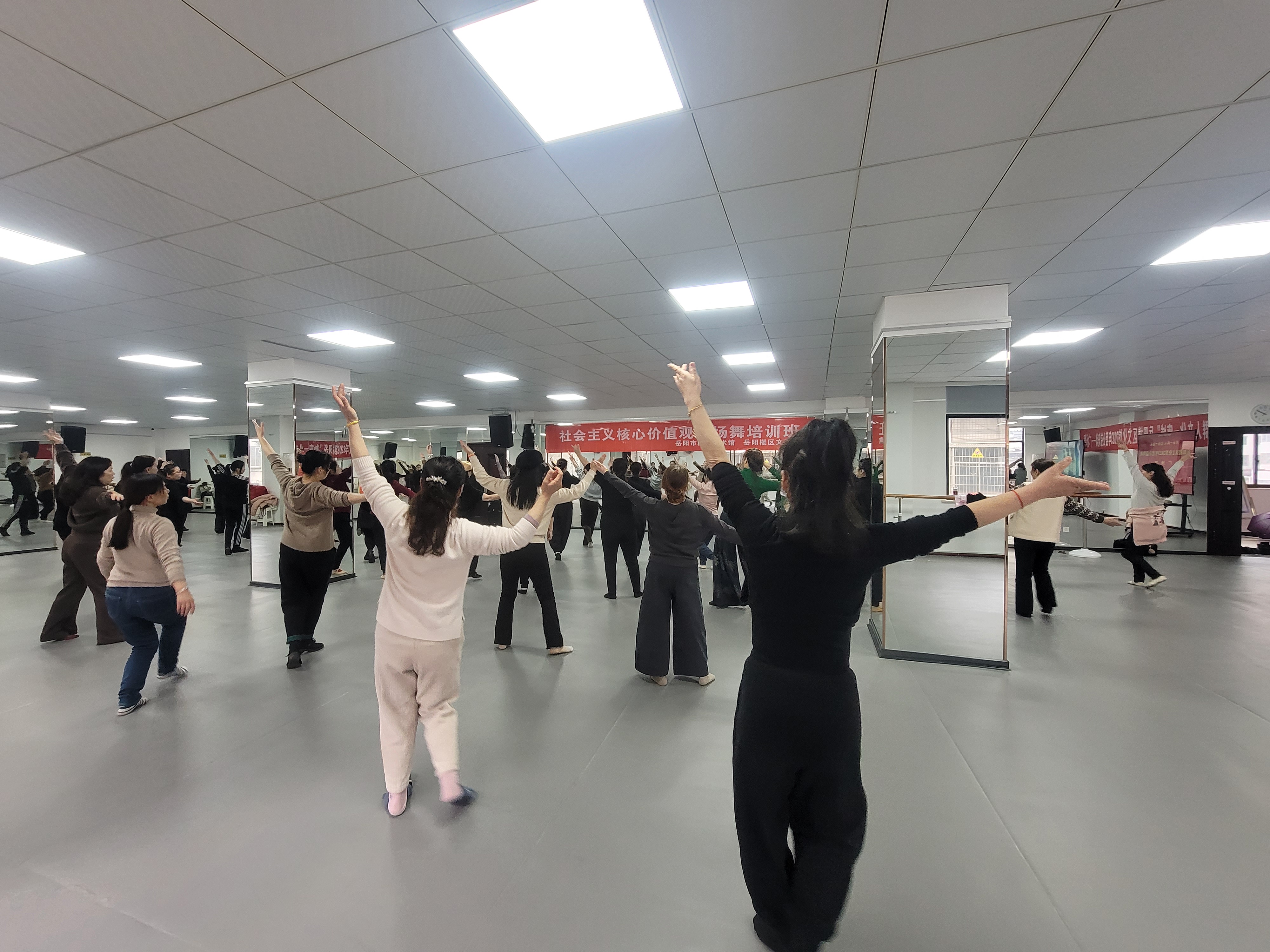2023年是宣传贯彻落实党的二十大精神的开局之年,为践行社会主义核心价值观,满足人民群众日益增长的文化需求,2月22日,岳阳市群众艺术馆联合岳阳楼区文化馆举办2023年社会主义核心价值观广场舞推广培训班在岳阳楼区文化馆训练厅开课。市群艺馆舞蹈专干和岳阳楼区文化馆舞蹈专干对这套广场舞进行了重新编排,增加了新的内容。参加此次培训的学员是来自市直及各县市区新增的文艺团队。