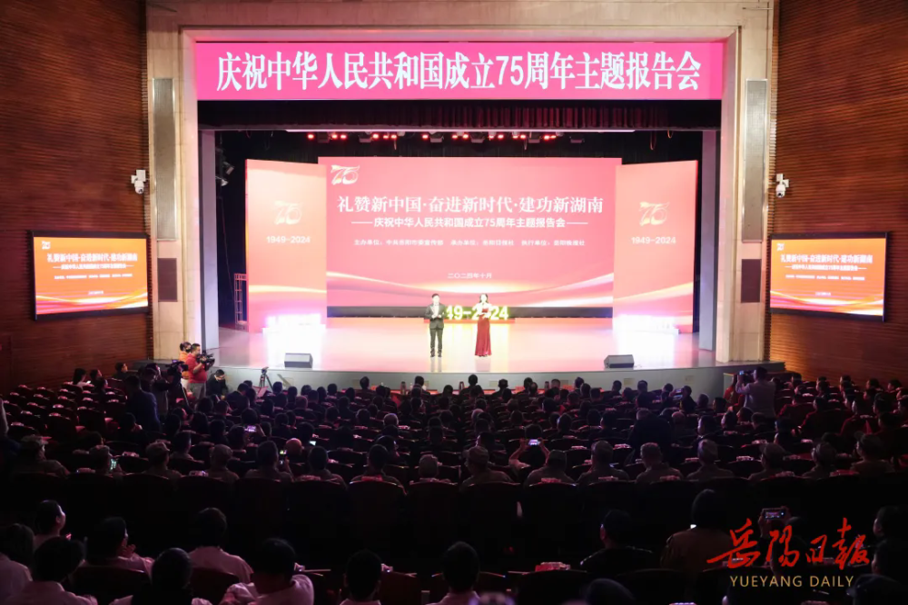 10月22日,“礼赞新中国·奋进新时代·建功新湖南”——岳阳市庆祝中华人民共和国成立75周年主题报告会在岳阳市文化馆(岳阳市文化艺术会展中心、岳阳大剧院)大剧场举行。省委常委、市委书记谢卫江,市委副书记、市长李挚,市委副书记汪涛,与市直和中央、省驻岳单位及各县市区党委宣传部负责同志、各界代表等共同聆听报告。