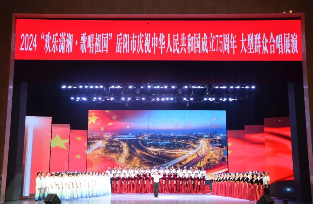 9月3日下午,岳阳文化艺术会展中心大剧场内掌声雷动、歌声飘扬。由岳阳市文化旅游广电局主办,岳阳市文化馆、各县(市、区)文化和旅游广电(体育)局承办及各县(市、区)文化馆协办的2024年“欢乐潇湘·歌唱祖国”岳阳市庆祝中华人民共和国成立75周年大型群众合唱展演在此举行,来自全市县(市、区)的10支合唱队伍同台表演,放声高歌。