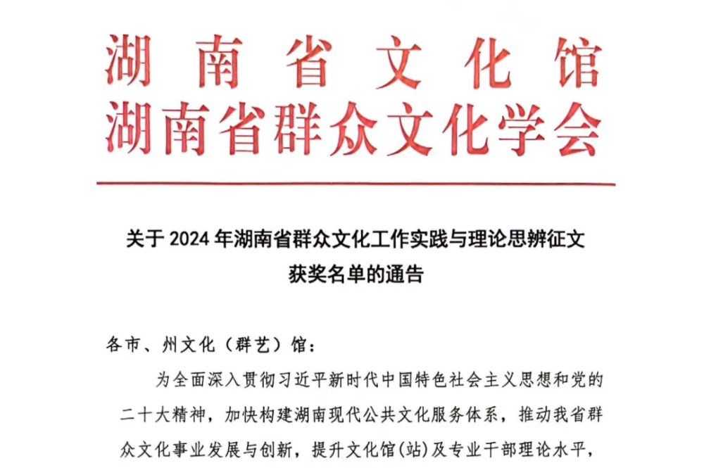 近日,由湖南省文化馆、湖南省群众文化学会主办的“2024年湖南省群众文化工作实践与理论思辨征文活动”获奖名单揭晓,经精心组织、积极报送,我馆选送的十篇论文获得奖项,数量达历年之最,群众文化理论研究成果再创佳绩。