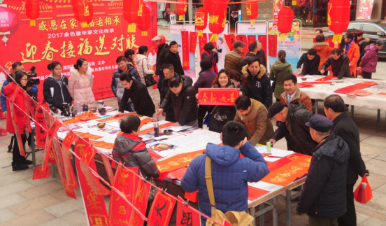 贴春联,福到家,红红火火过大年。今天,湘阴50余名书法家和书法爱好者兵分四路摆开阵势,现场挥毫泼墨近千副春联,给父老乡亲送出一份份新春的祝福。该县迎新春“我们的中国梦 湖湘文化进家”系列活动渐入高潮。