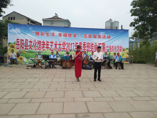 岳阳县文化馆老年艺术大学2017年上学期教学成果展演共四场,分别为:“综合班专场”、“京剧票友协会专场”、“舞蹈、太极、合唱班及文化馆雅韵艺术合唱团专场”、“花鼓戏、二胡、大筒班专场”,展演时间为6月20日、26日、27日、28日晚7:08分。本次展演有15个节目,文化志愿者50名,演员100名,现场观众800人以上,展演活动得到了广大百姓的喝彩与掌声。
