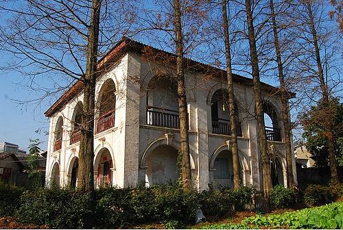 位于华容县注滋口镇墟场福音堂中街二组,距县城32公里,北临藕池河与插旗镇隔河相望,东与幸福乡毗邻,西南与南县接壤。民居建于20世纪20年代,建筑方向55,为东南—西北向,平面呈长方形,长14.85米,宽13.65米。砖木结构。建筑四面设计风格一致,建筑共两层,上下层四周分别设计为三个圆拱门形状,在建筑的东南侧和西北侧的中间拱门上方分别模印有菱形花纹图案,东南面的图案似人像,可能是房屋正面,西北面的图案为四叶花纹,在西北面两侧墙上部分别模印有一个五叶花纹图案。上层房间四周为回廊,四周设围栏,楼梯及楼板、围栏均为木质。在上层离屋顶不远处还设计有小隔楼,隔楼的东南、西北侧对外分别开一小窗户。屋顶为人字形屋脊,盖小青瓦。