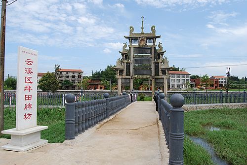 位于岳阳市云溪区云溪乡坪田村。始建于清光绪十四年(1888年),是清户部主事刘兆梅为其节母所立。牌坊以麻石、青石、汉白玉等石料砌成,高9米,宽6米,厚2米,占地面积12平方米,整个牌坊结构严谨,造型精美,是我省保存最完整的牌坊之一。1996年1月被公布为省级文物保护单位。