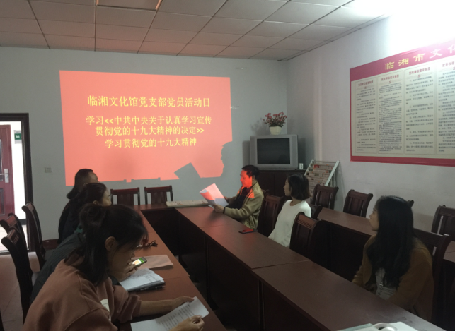 11月9日,临湘市文化馆党支部结合党员活动日,开展学习宣传贯彻党的十九大精神的决定。 张祥义书记强调所有党员同志要充分认识学习宣传贯彻党的十九大精神的重大意义,全面准确学习领会党的十九大精神,认真做好党的十九大精神的学习宣传,弘扬理论联系实际的学风,切实提高解决问题、推动发展的能力。全体党员要进一步增强“四个意识”,坚定“四个自信”,迅速掀起学习宣传贯彻党的十九大精神的热潮,进一步增强政治理论学习的自觉意识,结合群文工作努力提高政治素养和思想理论水平,以更好适应新时代新要求发挥新作为。