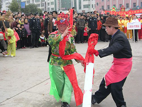 三、平江历有渔鼓、莲花闹、送春牛,赞土地等说唱表演,历史故事和传鉴以唱为主,加上道白和表演动作,用说唱艺术形式表现出来,形成了灯戏综合艺术。