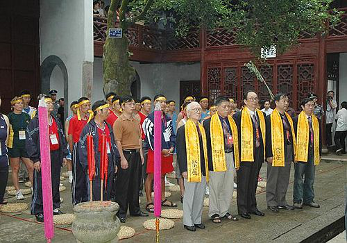 仪式开始,东礼宾宣布内外肃静,众礼宾出班、全场肃立,向三闾大夫神位鞠身了。接着主祭宾就位。陈设香案、酒樽、果仪、盥洗、鼓乐、读文、祭联、彩红诸所、执事焚香、燃烛、赞香、赞烛、捻鼓鸣金各三、大乐小乐各三,接着金鼓交奏,礼炮齐鸣。