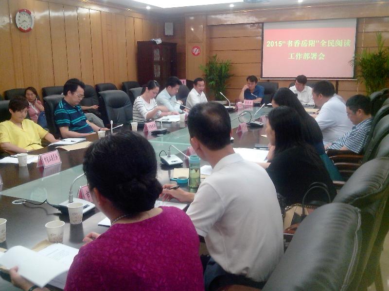 为大力推进我市全民阅读工作和书香岳阳建设,进一步倡导“多读书、读好书、善读书”的文明风尚,6月2日我市召开2015“书香岳阳”全民阅读工作部署会,市委常委、宣传部长徐新启做工作部署,相关部门负责人参与。