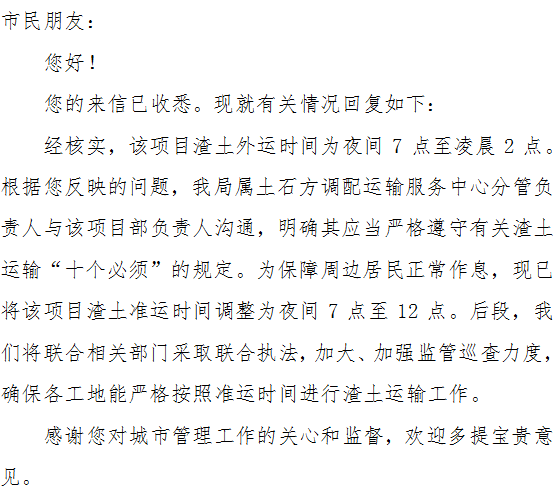 尊敬的领导: 最近一段时间,岳阳楼区洛王新天地附近的碧桂园楼盘施工的车辆,在晚上10点后也在非主干道紧密施工,经常施工到凌晨2点多,车辆的轰鸣声和刺耳的喇叭声不绝,严重影响了周边小区和住户的夜间休息。洛王社区和相关投诉电话都没能实际解决问题。请问一个楼盘的施工时间何以比市政地铁施工还要特殊呢?(长沙市政地铁施工也尽量避开了附近居民休息时间),希望相关市局领导能真真正正以结果为导向来协调处理好此事,感谢! |