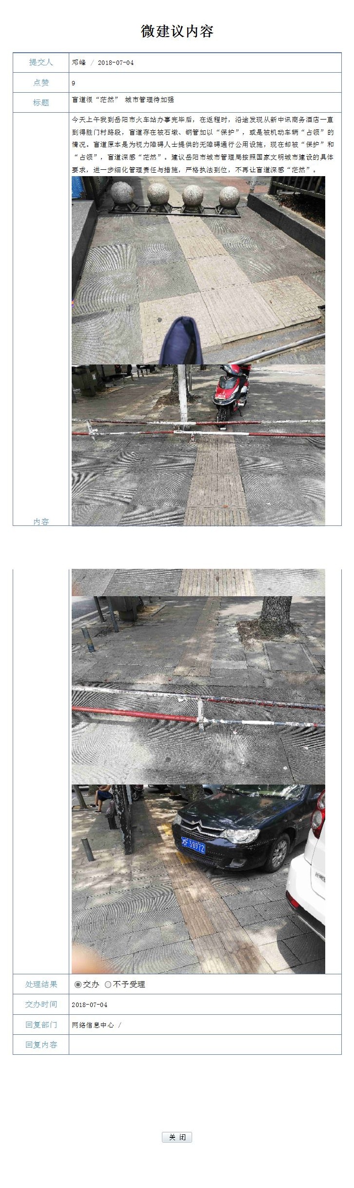 编号109190的市民来信我局已收悉,关于市民反映的问题已第一时间派往站前路管理中队进行处置,现站前路管理中队回复如下: 对于提到的问题,一部分属于市城管,现就我中队对管辖路段处理情况进行说明。中队安排队员到管辖路段查看,对于所说的石墩占设立在盲道上的问题,并未发现。有些许石墩立放在马路沿边上,防止机动车上人行道占用盲道。对于机动车占用盲道问题,中队每天都有专人对路段机动车压盲道问题进行劝导和张贴违章罚款单进行处理。下一步中队将加强机动车乱停靠问题的力度。 特此回复 楼区城管局 2018年7月18日 |