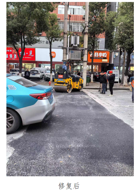 尊敬的市民: 您好!您关于《白石岭北路弘庆嘉园正大门口》的来信已收悉,现将有关情况回复如下: 经我局属市市政维护管理中心现场核实,白石岭北路弘庆嘉园正大门口路面确实存在凸起,现已于3月11日修复完毕。 感谢您对城市管理工作的理解、支持和监督,欢迎多提宝贵意见! 附件:现场图片 岳阳市城市管理和综合执法局办公室 2025年3月18日 附件: