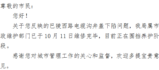 我的邮件cxm1475886299048:电缆沟维修,是十月八号提的,今天早上晨练经过该路段,发现维修工作已经开始了。岳阳城管这种工作态度和为人民办实事的精神,值得大力宣传和学习。