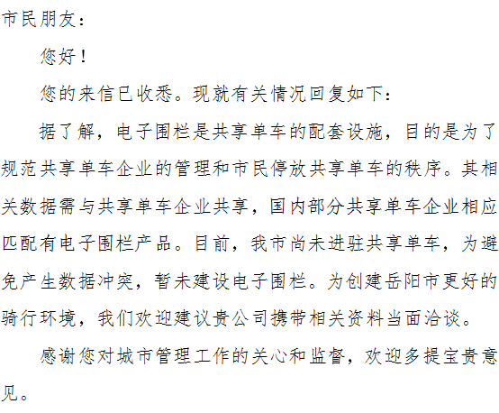 尊敬的岳阳市人民政府: 为了进一步规范管理共享单车,广东亦强科技有限公司以《关于鼓励和规范互联网租赁自行车发展的指导意见》(交运发〔2017〕109号)为指导,向岳阳市人民政府提出申请,由我公司全额出资,在岳阳市建设公益性共享单车电子围栏。如获批准,我们将于2017年底建设2000个共享单车电子围栏,并力争在2018年6月,将共享单车电子围栏覆盖岳阳市。协助政府规范管理共享单车,让共享单车更好地为人们提供出行服务,并助力城市交通的建设与发展。 公司简介及公益性电子围栏建设等相关情况附后。 专此请示,盼复。 广东亦强科技有限公司 2017年10月 |